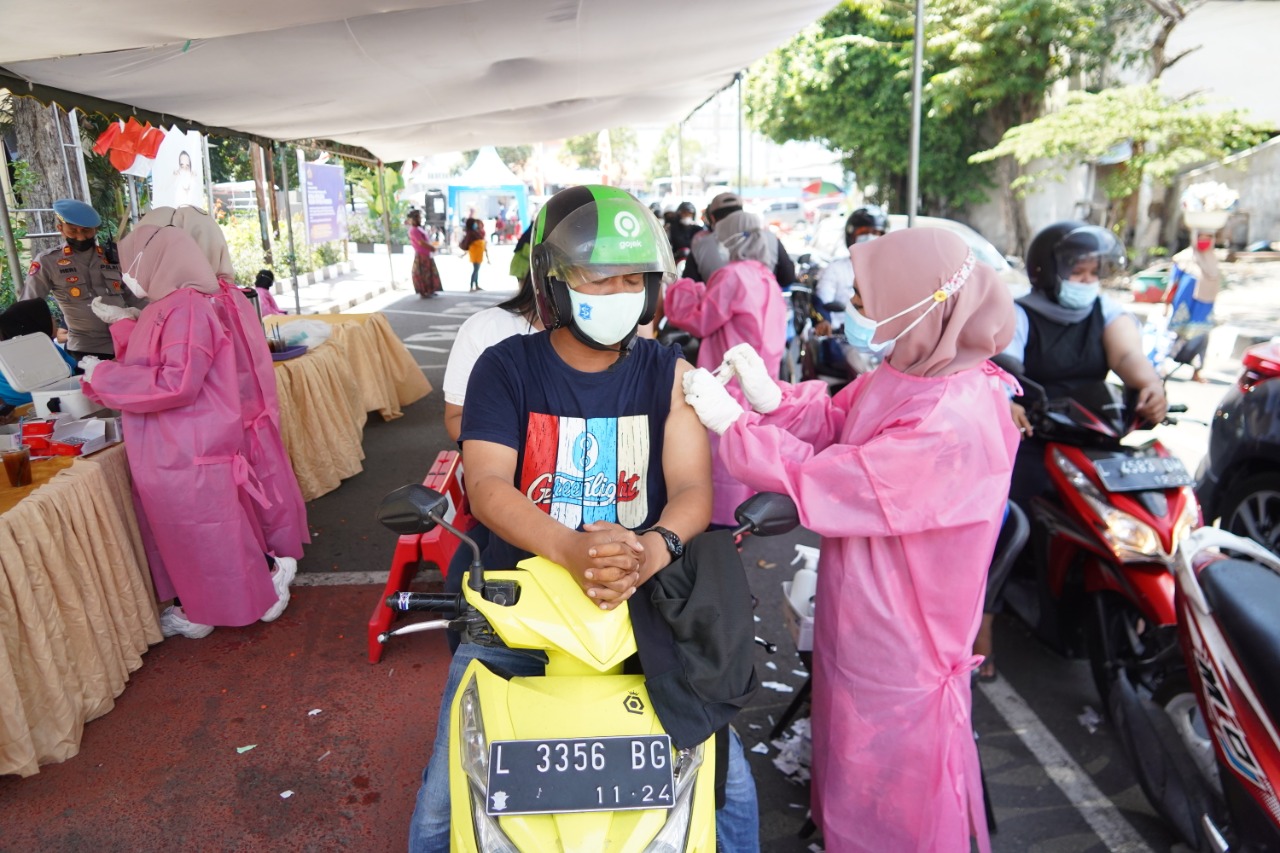 Seperti biasa vaksinasi dilaksanakan dengan para peserta tetap berada di kendaraan masing-masing. Baik motor maupun mobil.
