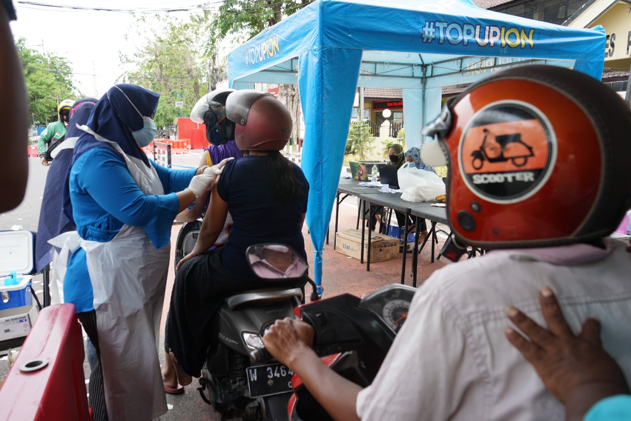 Mereka bergerak dengan tetap mengendarai kendarannya sesuai antrian dan menjalani proses screening kesehatan hingga penyuntikkan vaksin dengan tetap berada di kendaraan masing-masing.