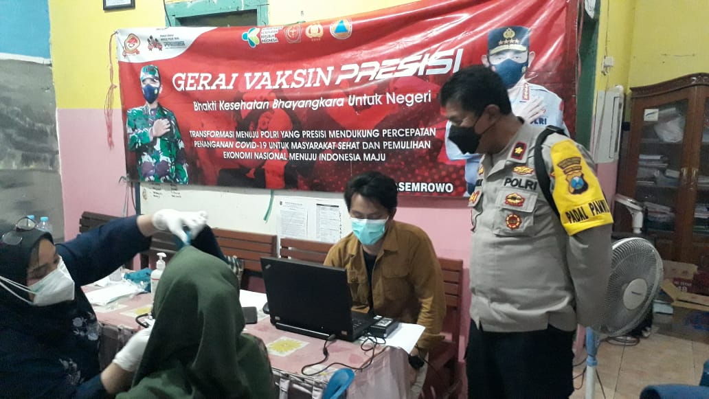 Seputarperak.com – Polres Pelabuhan Tanjung Perak, Polsek Asemrowo menggelar vaksinasi Covid-19 di malam hari bagi warganya bertempat di Balai Rw. 06 Jl. Tambak Pring Timur Gg. III No. 59 Kelurahan Asemrowo Kecamatan Asemrowo Surabaya. Jumat malam (29/10/2021)