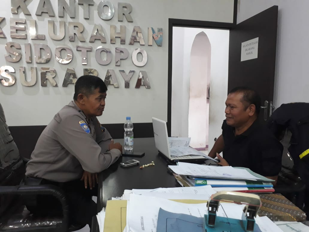 Seputarperak.com- Koordinasi dilakukan Aiptu Muhadi Syukur, Babinkamtibmas Sidotopo, Polsek Semampir, Polres Pelabuhan Tanjung Perak dengan pihak kelurahan terkait rencana operasi yustisi, Sabtu, 27 Oktober 2018.