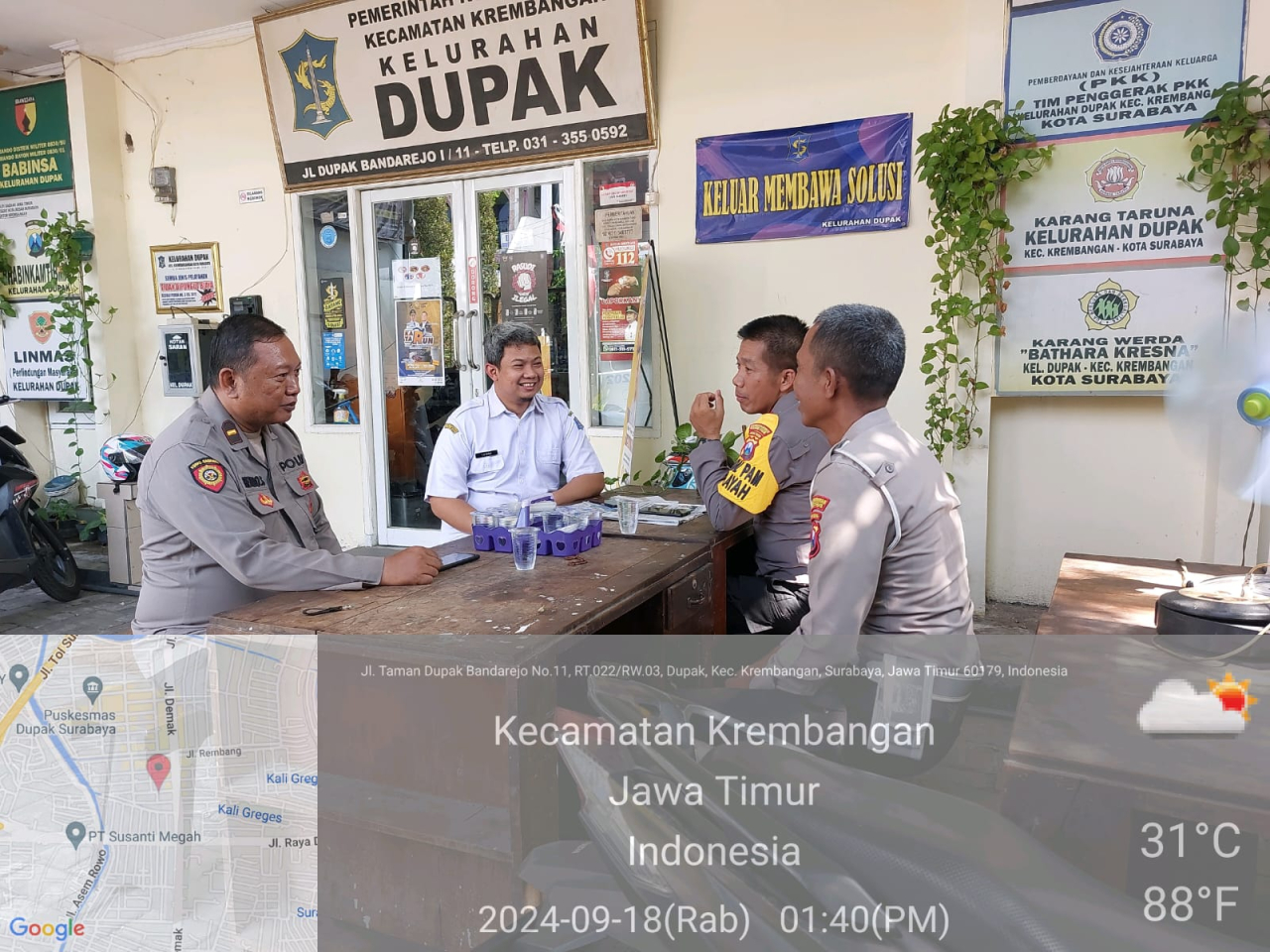 Seputarperak.com- Kapolsek Krembangan bersama dengan Pejabat Pengawas dan Kanit Lalu Lintas melaksanakan kegiatan sambang ke Kelurahan Dupak, Kecamatan Krembangan, untuk berkoordinasi dengan Pak Lurah menjelang pelaksanaan Pemilihan Kepala Daerah (Pilkada) pada hari Rabu, 18 September 2024. Kegiatan ini bertujuan untuk menciptakan situasi keamanan dan ketertiban masyarakat (kamtibmas) yang kondusif.