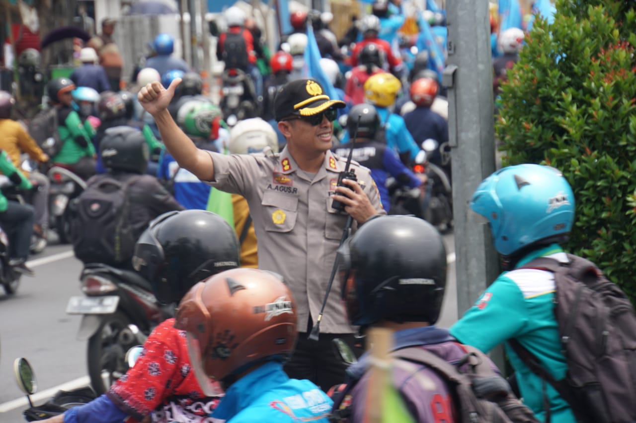Sambil ikut melakukan pengaturan, Kapolres saat itu juga mengingatkan para buruh agar mekukan konvoi dengan tertib dan tidak mengganggu pengguna jalan lainnya.