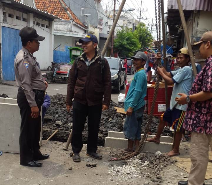 Seputarperak.com- Himbauan keselamatan kerja disampaikan Aiptu M Yasin, Babinkamtibmas Krembangan Utara, Polsek Pabean Cantikan, Polres Pelabuhan Tanjung Perak kepada para pekerja perbaikan saluran selokan di Jalan Kemudi, Sabtu pagi, 24 Nopember 2018.
