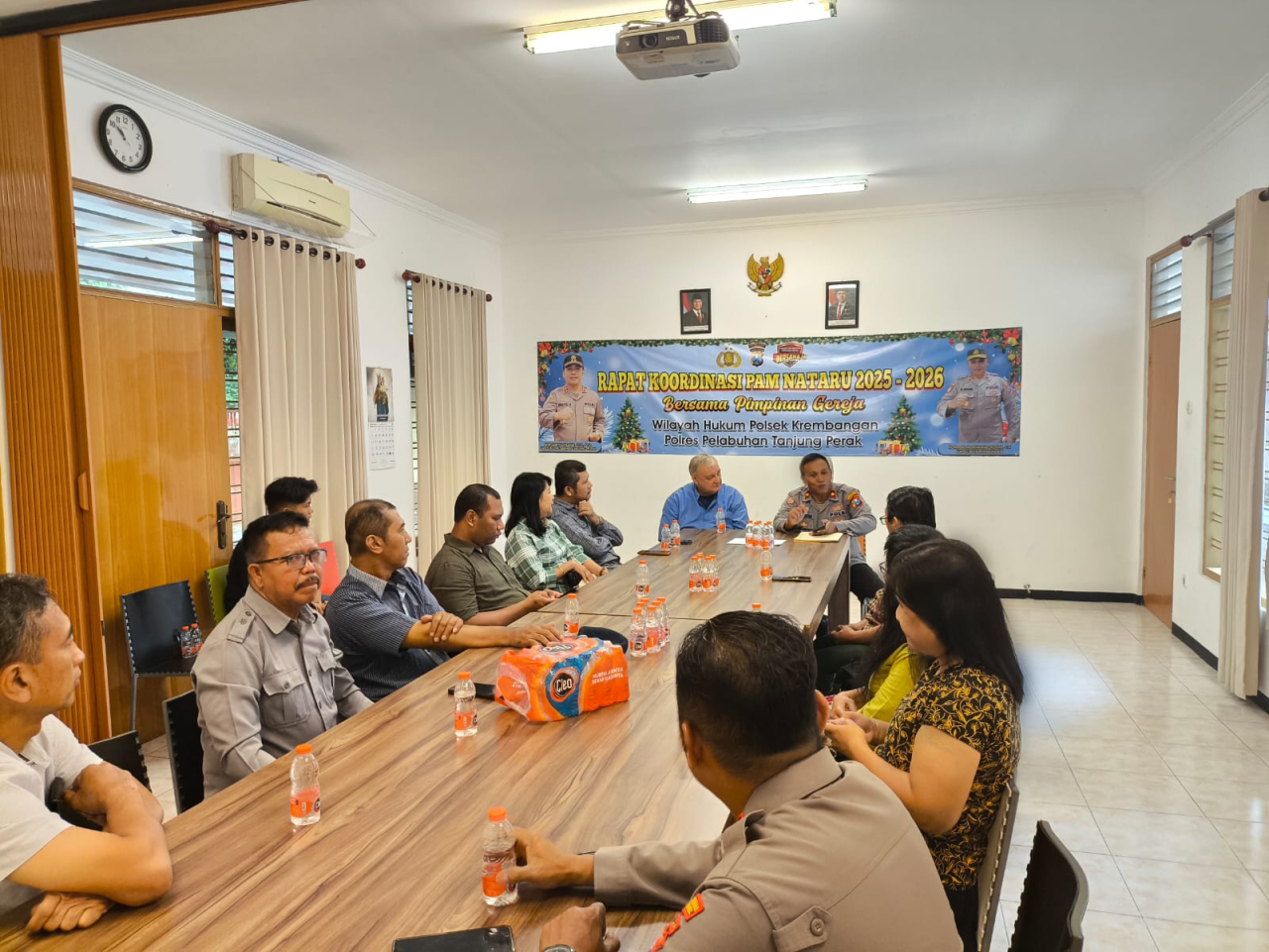 Seputarperak.com – Kamis, 18 Desember 2025 Kapolsek Krembangan bersama Wakapolsek, piket fungsi, serta Bhabinkamtibmas Kelurahan Perak Barat melaksanakan kegiatan rapat koordinasi bersama para pimpinan gereja di wilayah hukum Polsek Krembangan. Kegiatan yang berlangsung pada Kamis pagi sekitar pukul 10.30 WIB ini bertempat di Gereja Santo Mikael dan dilaksanakan sebagai langkah awal dalam rangka kesiapan pengamanan perayaan Ibadah Natal dan Tahun Baru agar berjalan aman, tertib, dan kondusif.