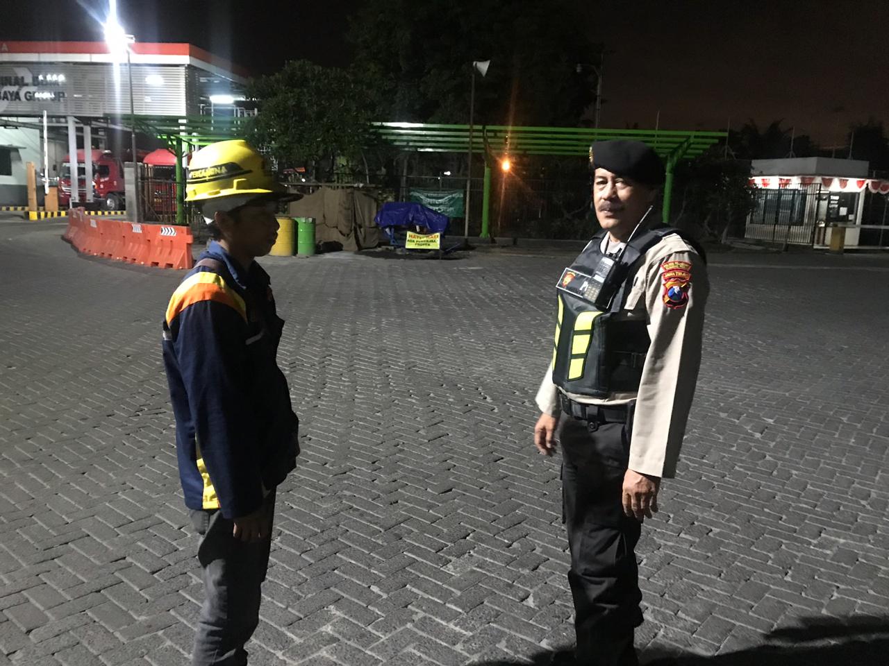 Seputarperak.com- Patroli dialogis dilakukan personil Satsabhara Polres Pelabuhan Tanjung Perak di Depo Pertamina, Jalan Perak Barat, Minggu malam, 2 Desember 2018.