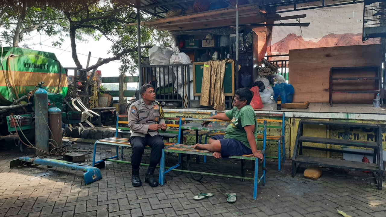 Dalam kegiatan tersebut, petugas melakukan dialog bersama tokoh masyarakat setempat, Bapak Paino, guna menyampaikan pesan-pesan harkamtibmas kepada warga sekitar.
