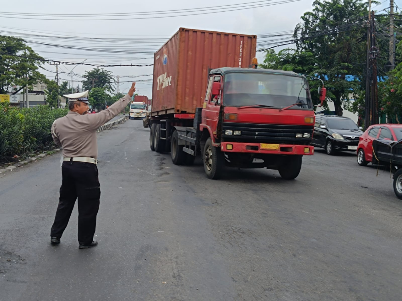 Personel kepolisian melakukan pengaturan langsung di lapangan guna memastikan arus kendaraan tetap bergerak serta meminimalisir potensi kemacetan panjang di kawasan tersebut.