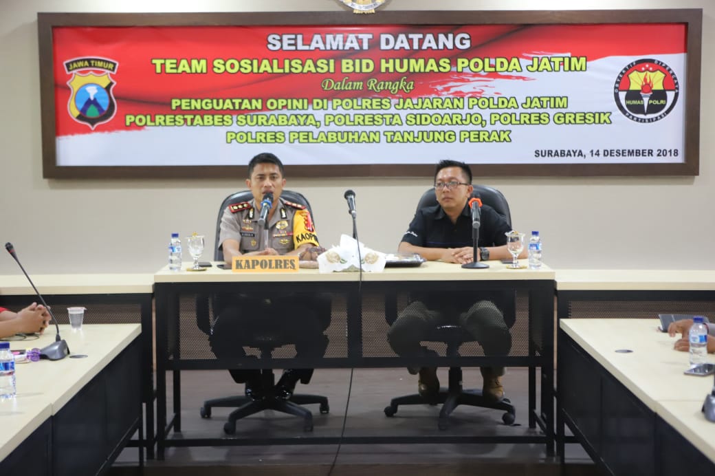 Seputarperak.com- Kegiatan Sosialisasi Bid Humas Polda Jatim Dalam Rangka Penguatan Opini di Polres Jajaran Polda Jatim, digelar di Ruang Rupatama Sanika Satyadwada, Polres Pelabuhan Tanjung Perak, Jumat siang, 14 Desember 2018.