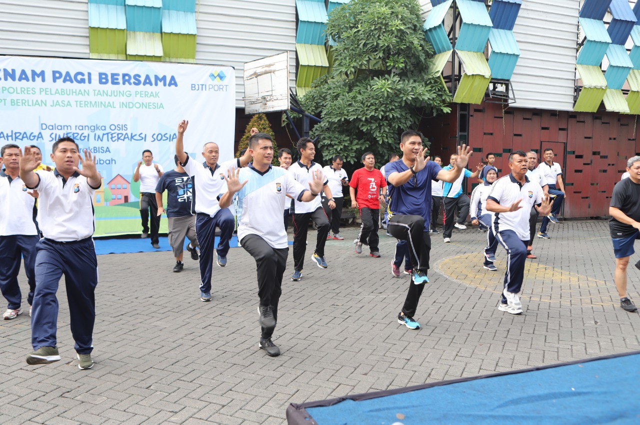 Seputarperak.com- Olahraga bersama digelar beberapa personil Polres Pelabuhan Tanjung Perak bersama karyawan dan pimpinan PT BJTI (Berlian Jasa Terminal Indonesia), Jumat pagi, 14 Desember 2018.
