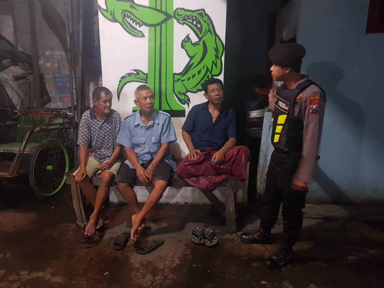 Saat itu personil Satsabhara juga menyampaikan pesan-pesan kamtibmas kepada warga yang tengah nongkrong di ujung gang dekat Pos kamling.