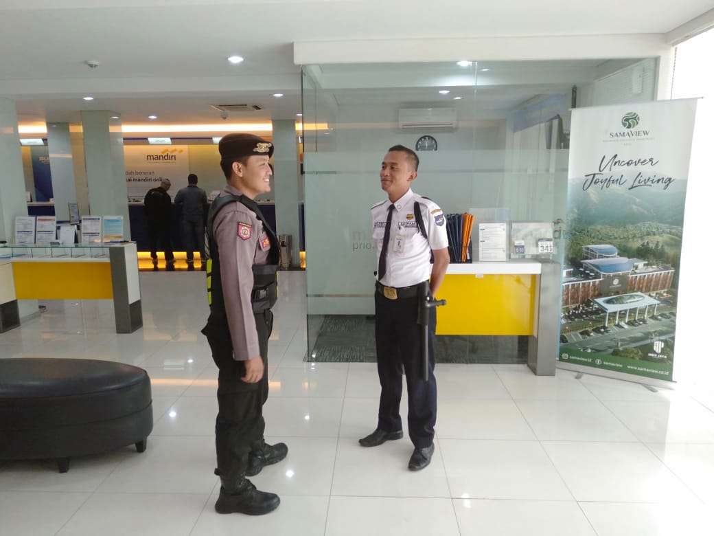 Dalam kunjungannya, personil Satsabhara melakukan koordinasi pengamanan dengan petugas sekuriti setempat.