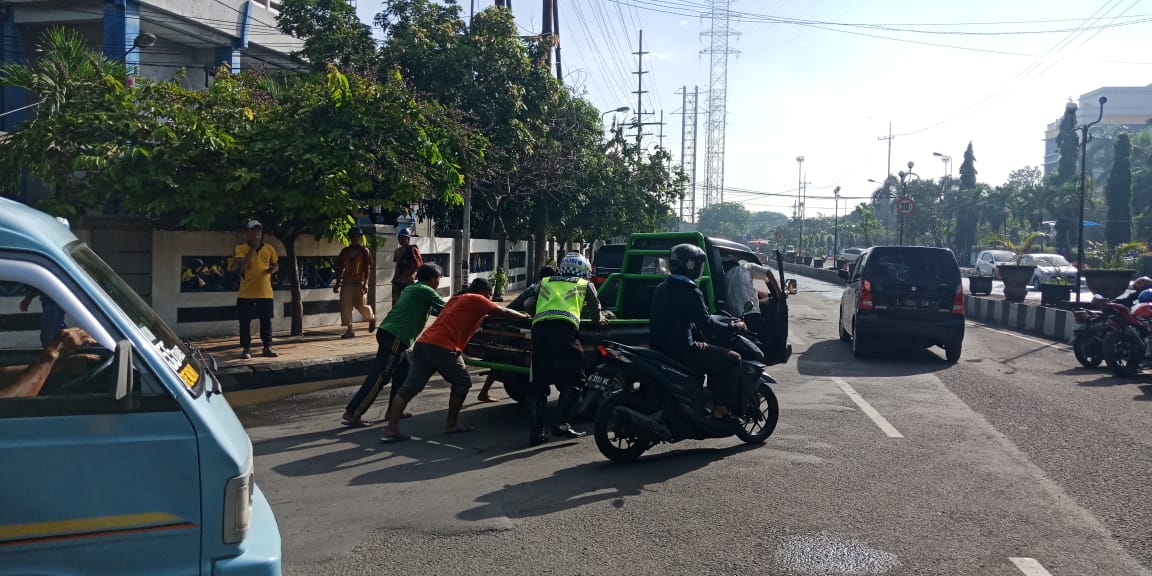 Saat melaksanakan pengaturan lalu lintas pagi, anggota Satlantas yang melihat sebuah mobil pickup tiba-tiba mogok di tengah jalan, segera mengambil tindakan.