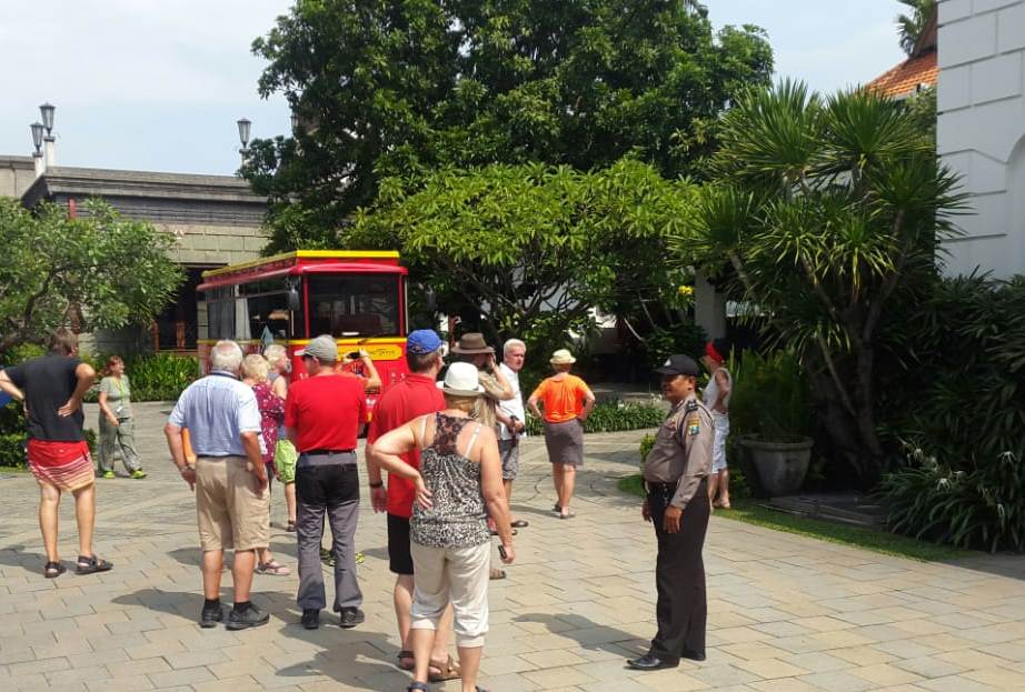 Seputarperak.com- Pengamanan turis manca negara penumpang kapal pesiar mewah Aidavita Cruises dilakukan Aiptu M Yasin, Babinkamtibmas Krembangan Utara, Polsek Pabean Cantikan, Polres Pelabuhan Tanjung Perak di House of Sampoerna, Jumat pagi, 15 Pebruari 2019.