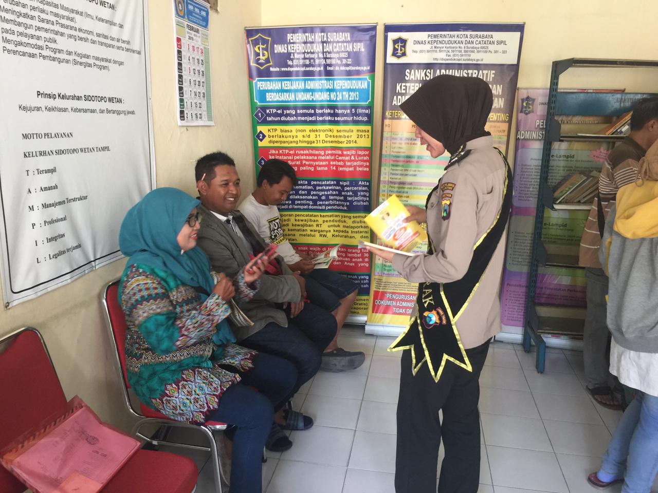 Kegiatan ini dilaksanakan oleh Bripda Arfanda dan Bripda Frisca dengan menyampaikan adanya SPKT door to door kepada masyarakat yang ada di kantor Kelurahan Sidotopo Wetan.