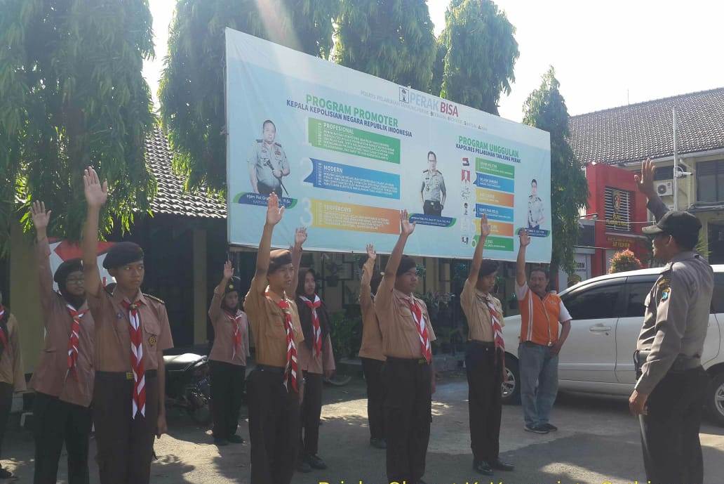 Seputarperak.com- Pelatihan pengaturan dasar lalu lintas diberikan anggota Satbinmas Polres Pelabuhan Tanjung Perak kepada 16 anggota Pramuka di lapangan apel Mapolres, Minggu pagi, 17 Pebruari 2019.