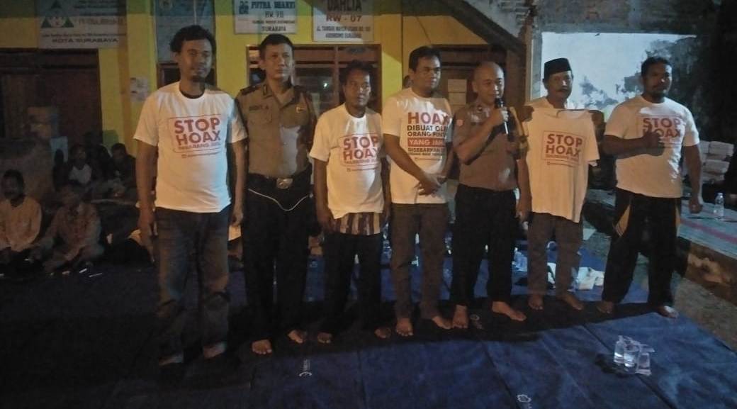 Saat itu Kapolsek Asemrowo juga membagikan lima buah kaos bertuiliskan anti hoax, kepada lima orang warga masyarakat yang bisa menjawab pertanyaan secara cepat dan benar. (hum)