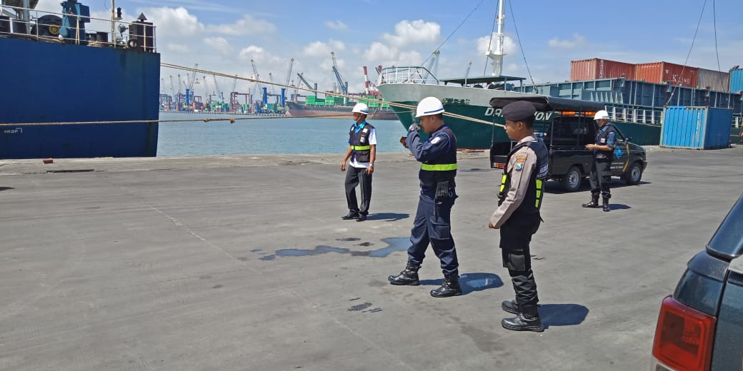 Seputarperak.com- Patroli dilakukan Satsabhara Polres Pelabuhan Tanjung Perak bersama sekuriti Pelindo di Terminal Jamrud Selatan, Senin pagi, 18 Maret 2019.