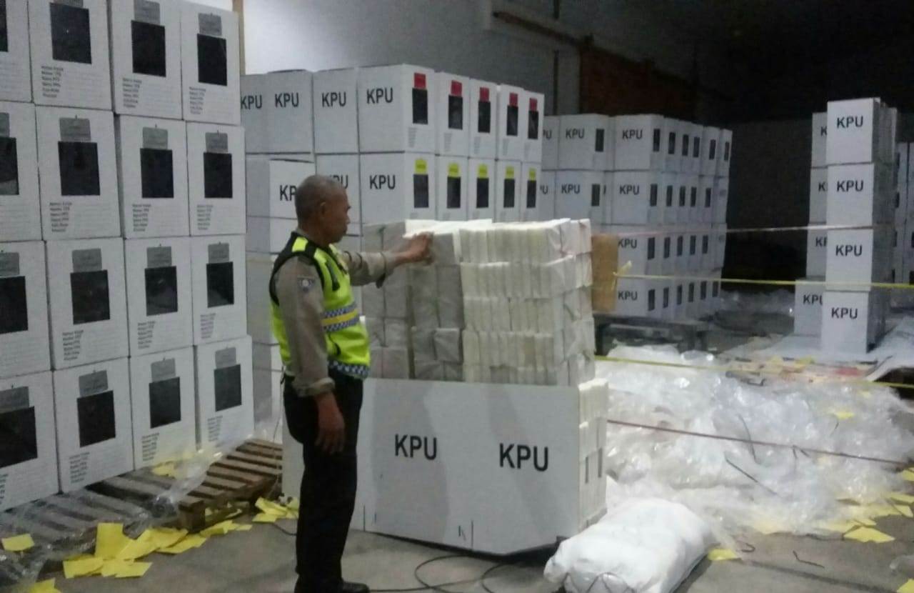 Saat itu Aiptu Muchson melakukan pemantauan di sekeliling ruangan yang menjadi gudang logistik Pemilu berupa kotak suara.