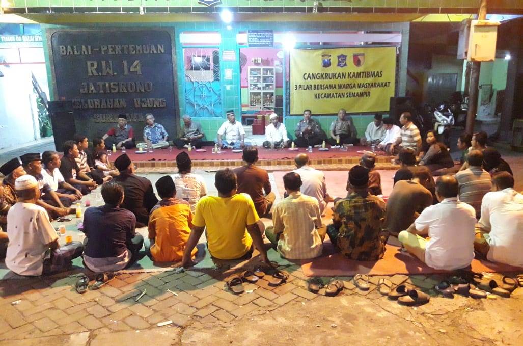 Seputarperak.com- Kegiatan cangkrukan kamtibmas juga dilaksanakan Polsek Semampir, Polres Pelabuhan Tanjung Perak di depan Balai RW 14 Jalan Jatisrono, Kelurahan Ujung, Senin malam, 1 April 2019.