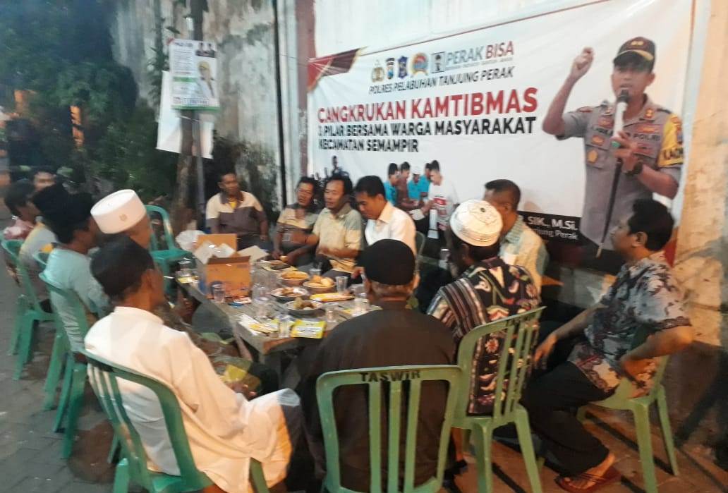 Seputarperak.com- Cangkrukan kamtibmas dilakukan personil Polsek Semampir, Polres Pelabuhan Tanjung Perak, Selasa malam, 2 April 2019 di RW 11, Jalan Sidotopo Sekolahan IV.