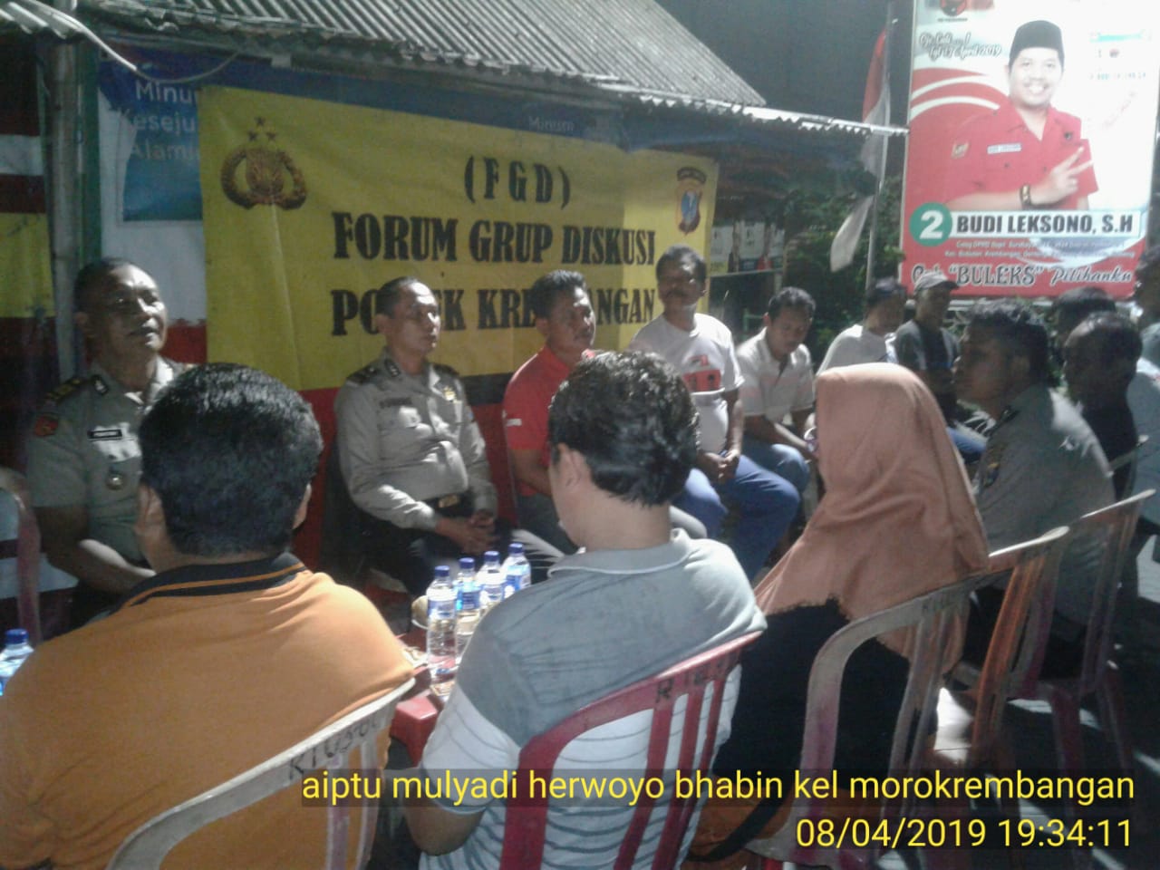 Seputarperak.com- Kegiatan cangkrukan kamtibmas dilaksanakan Polsek Krembangan, Polres Pelabuhan Tanjung Perak Senin malam, 8 April 2019 di RT 03 RW 06 Bosem Morokrembangan.