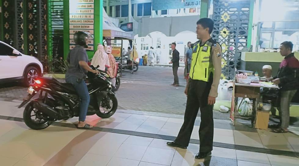 Seputarperak.com- Pengamanan Sholat Tarawih di Masjid Mujahidin, Jalan Perak Barat dilaksanakan personil Satlantas Polres Pelabuhan Tanjung Perak, Selasa malam, 7 Mei 2019.