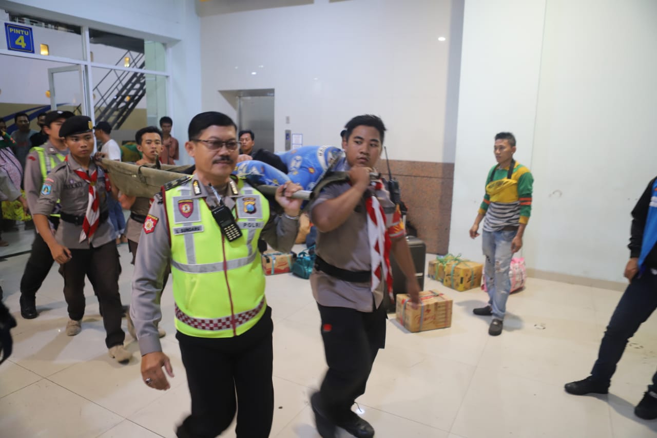 Seperti halnya yang dilakukan personil Satsabhara Polres Pelabuhan Tanjung Perak, Jumat pagi, 31 Mei 2019, yang membantu menggotong seseorang yang pingsan setelah sesaat turun dari KM Gunung Dempo.