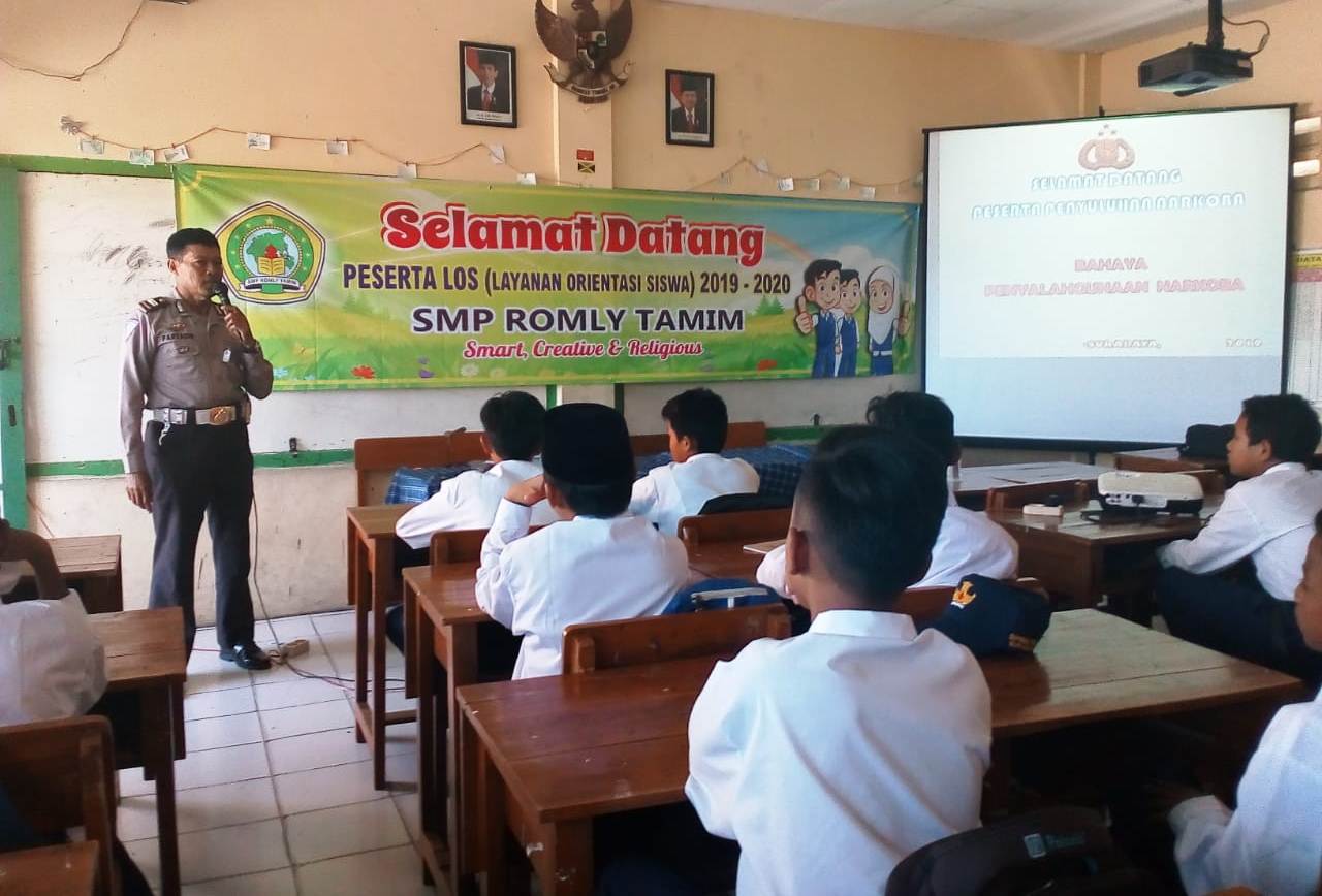 Seputarperak.com- Penyuluhan bahaya narkoba disampaikan Ipda Paryadin, Panit Lantas Polsek Kenjeran, Polres Pelabuhan Tanjung Perak kepada murid-murid SMP Romly Tamim, Jalan Kenjeran.