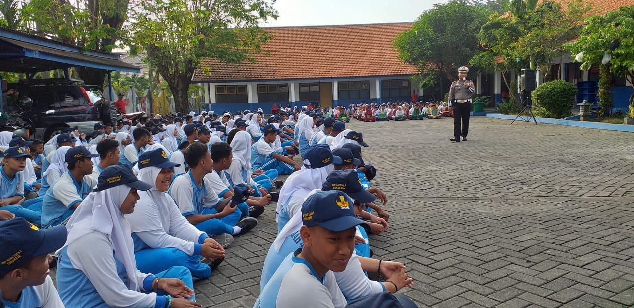 Seputarperak.com- Sosialisasi tertib berlalu lintas disampaikan anggota Satlantas Polres Pelabuhan Tanjung Perak kepada murid-murid SMP Hang Tuah 4 Surabaya, Jalan Ikan Sepat, Kelurahan Perak Barat, Kamis pagi, 18 Juli 2019.